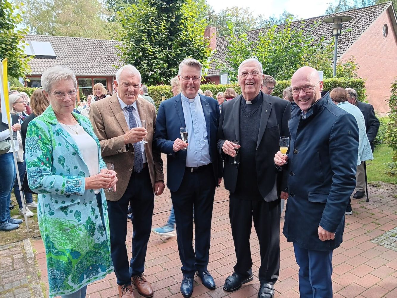 Die frühere Dorfkapelle auf dem Hof Wienken-Harbers, die Erweiterung zu einer Notkirche in der frühen Nachkriegszeit, die zum Gebetsraum umfunktionierte Diele auf dem Hof Hölscher und schließlich der Neubau der eigenen Pfarrkirche „Heilig Kreuz“ im Jahr 1954: „Das alles hat kein Bischof befohlen, das haben die Menschen hier gewollt und durchgesetzt“, betonte Ehrengast Dr. Wilfried Hagemann in seiner Festpredigt: „Kirche von unten aufgebaut, so wie es sein soll“. Gleichwohl sei auch die enge Anbindung an die Katholische Akademie Stapelfeld wichtig, denn die Gesellschaft brauche beides – den Glauben und eine werte-orientierte humanistische Bildung.