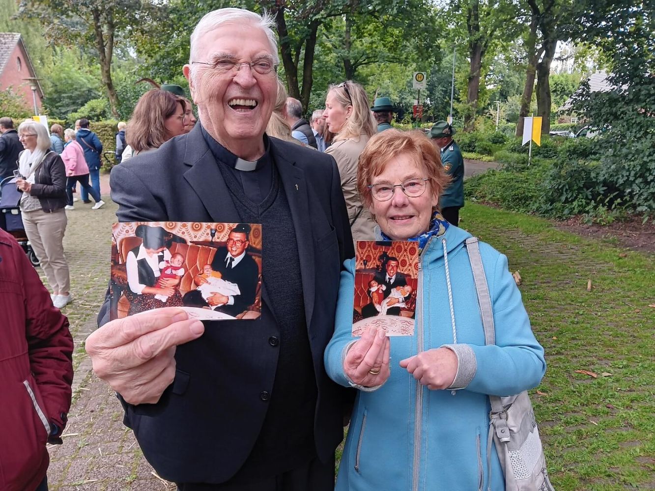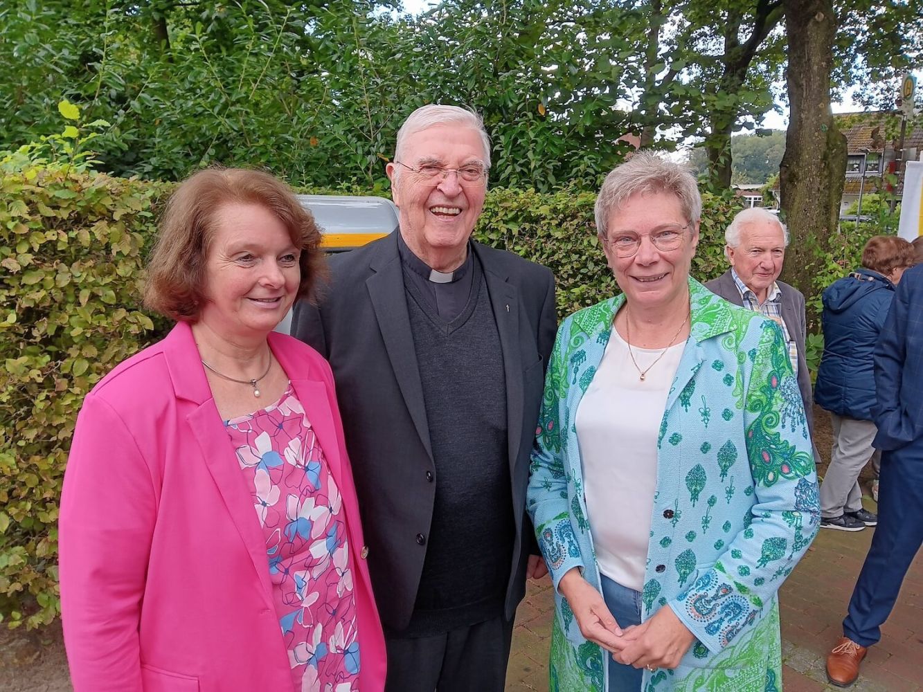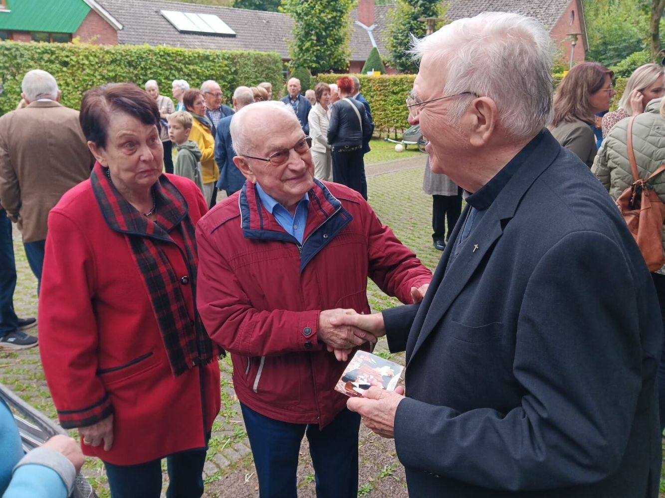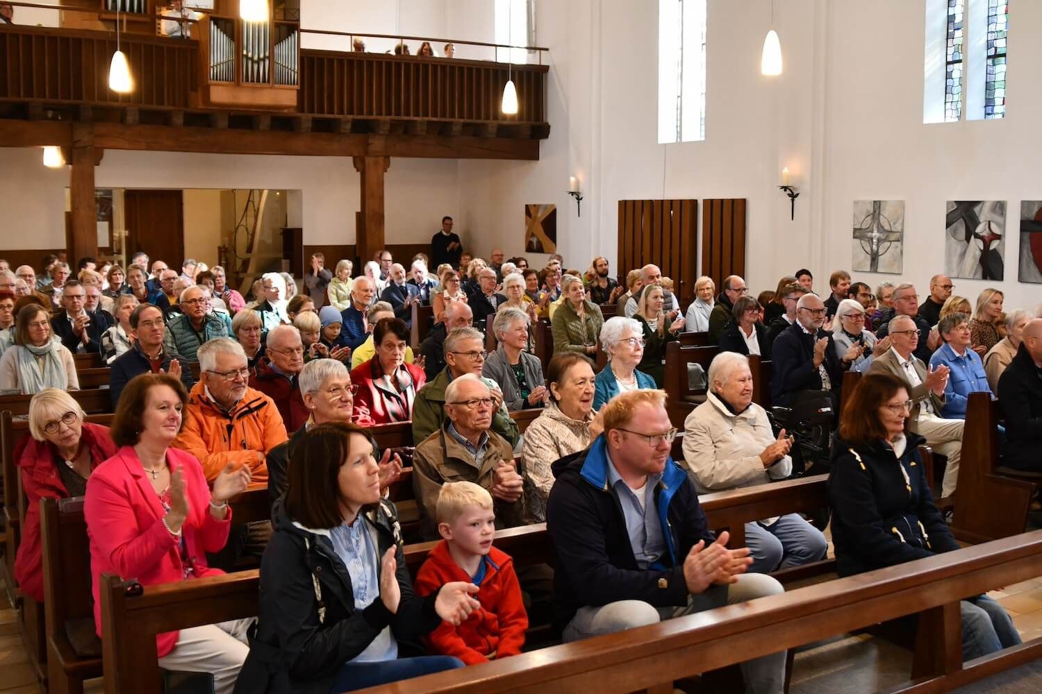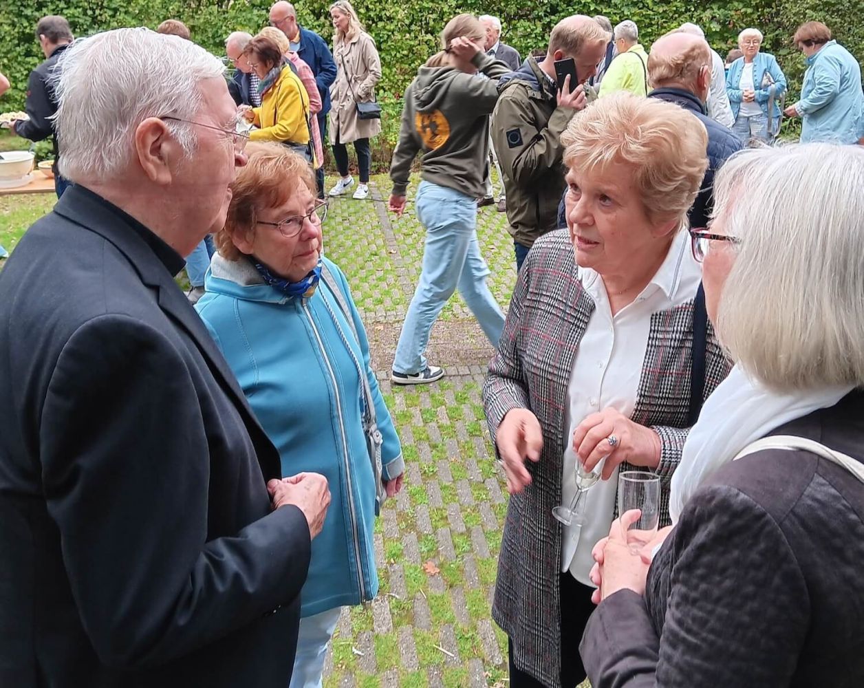 Der 86-jährige, inzwischen emeritierte Priester war von 1974 bis 1987 Pfarrer in Stapelfeld und freute sich sichtlich, nicht nur als Konzelebrant an der Seite von Dr. Marc Röbel wieder einen Gottesdienst hier zu feiern, sondern beim anschließenden Pfarrfest auch viele seiner damaligen „Schützlinge“ wiederzusehen: Ehepaare, die er getraut hatte und die heute schon ihre Goldene Hochzeit hinter sich haben, Taufkinder und Messdiener, die er auf ihren Wegen begleiten durfte und die er alle noch wiedererkannte. Deren Kinder und Enkel lernte Dr. Hagemann dabei auch kennen; einige sangen mit in der neuen Mini-Schola, die für ihren ersten Auftritt mit großem Applaus belohnt wurde, ebenso wie der Chor „Voices“, der das Hochamt mit Liedern zum Thema „Kreuz“ musikalisch gestaltete.