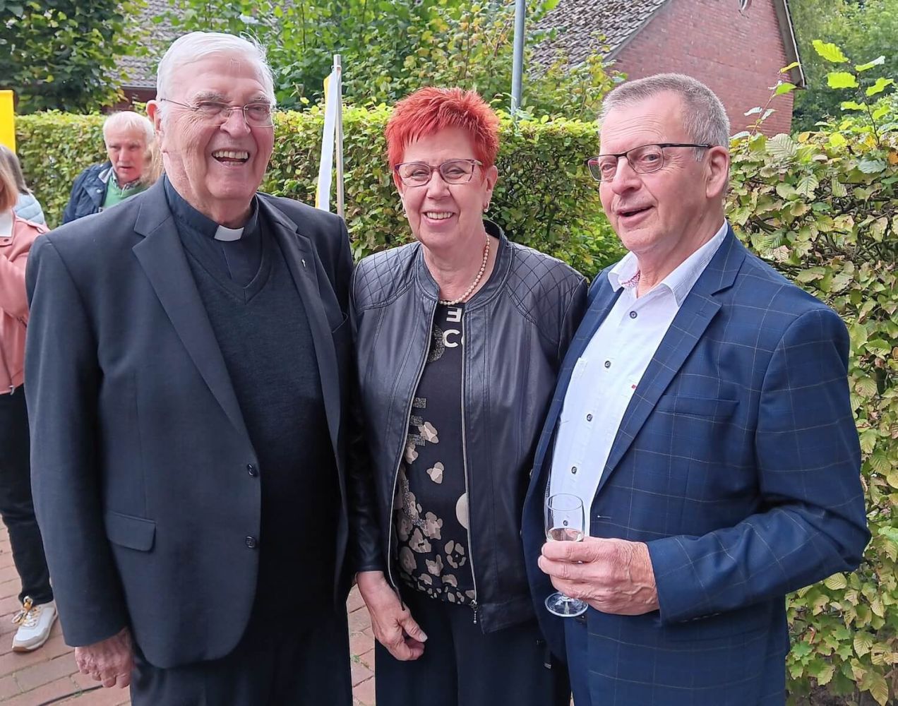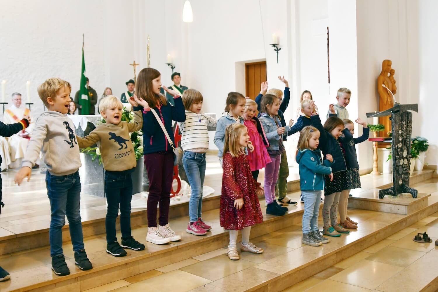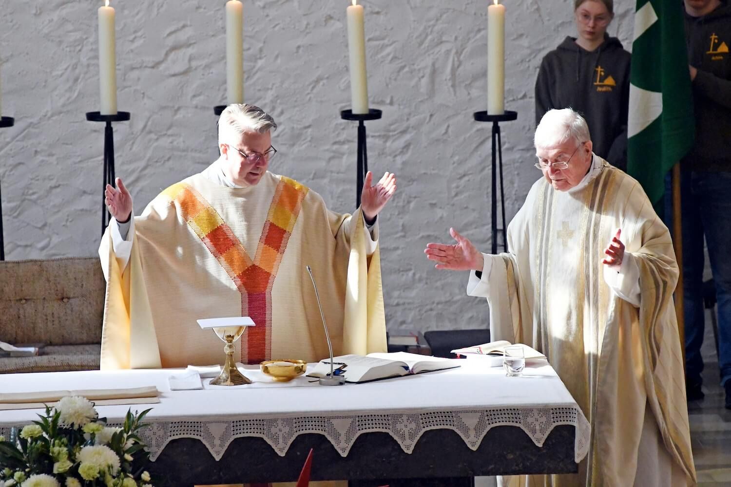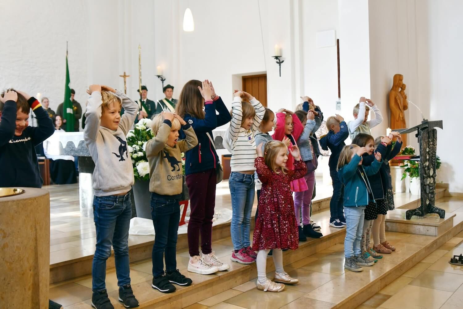 Der 86-jährige, inzwischen emeritierte Priester war von 1974 bis 1987 Pfarrer in Stapelfeld und freute sich sichtlich, nicht nur als Konzelebrant an der Seite von Dr. Marc Röbel wieder einen Gottesdienst hier zu feiern, sondern beim anschließenden Pfarrfest auch viele seiner damaligen „Schützlinge“ wiederzusehen: Ehepaare, die er getraut hatte und die heute schon ihre Goldene Hochzeit hinter sich haben, Taufkinder und Messdiener, die er auf ihren Wegen begleiten durfte und die er alle noch wiedererkannte. Deren Kinder und Enkel lernte Dr. Hagemann dabei auch kennen; einige sangen mit in der neuen Mini-Schola, die für ihren ersten Auftritt mit großem Applaus belohnt wurde, ebenso wie der Chor „Voices“, der das Hochamt mit Liedern zum Thema „Kreuz“ musikalisch gestaltete.