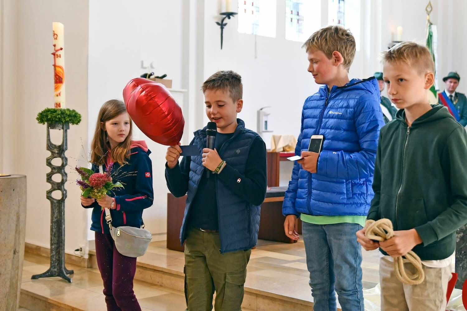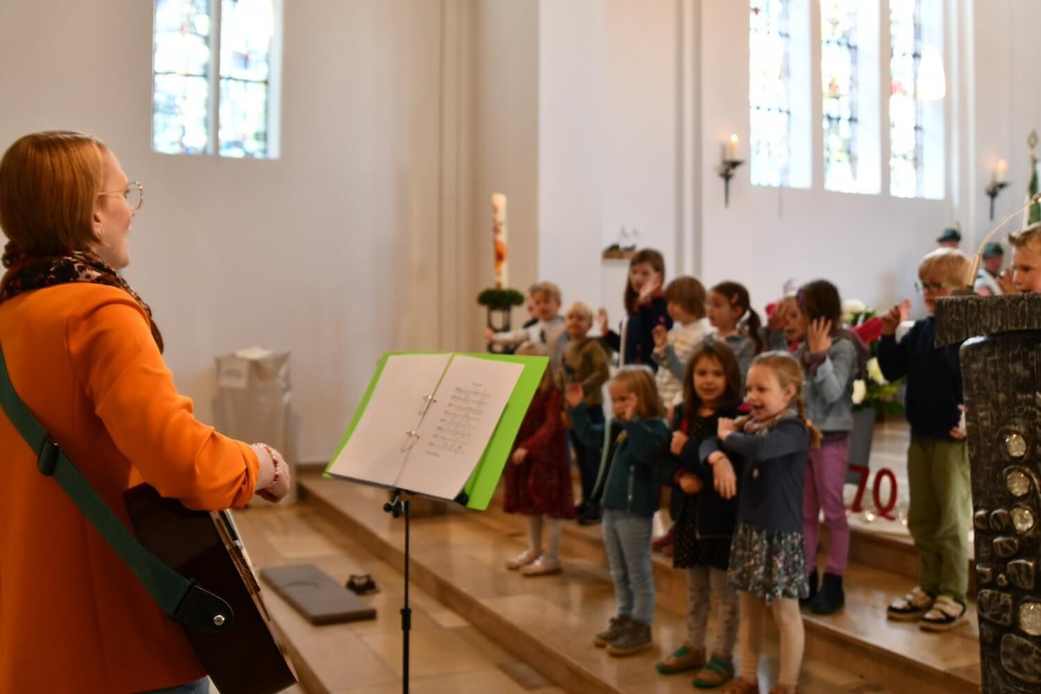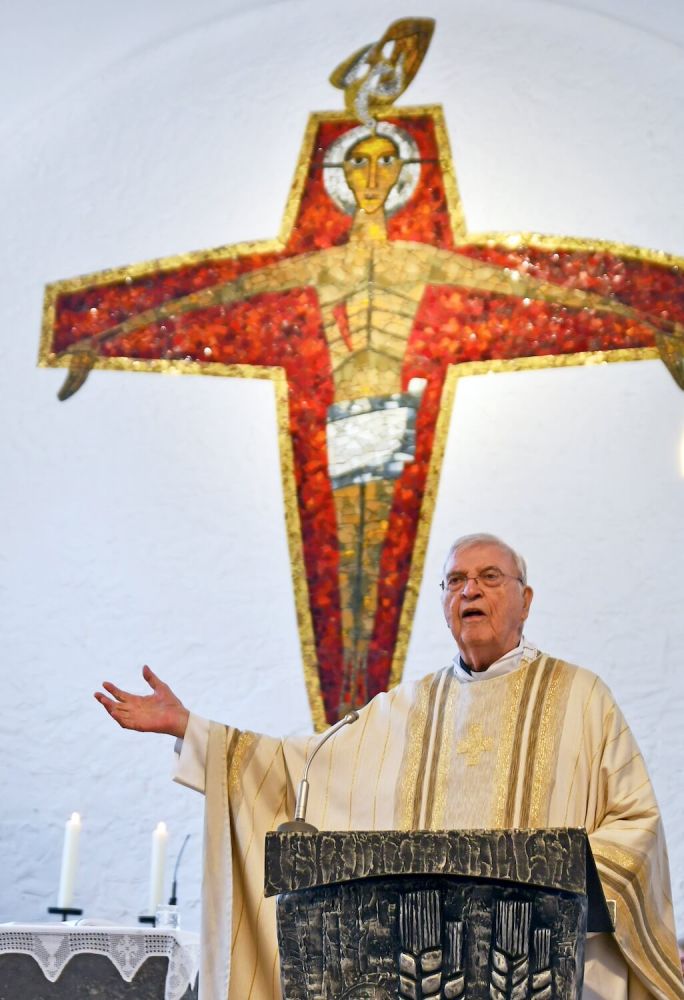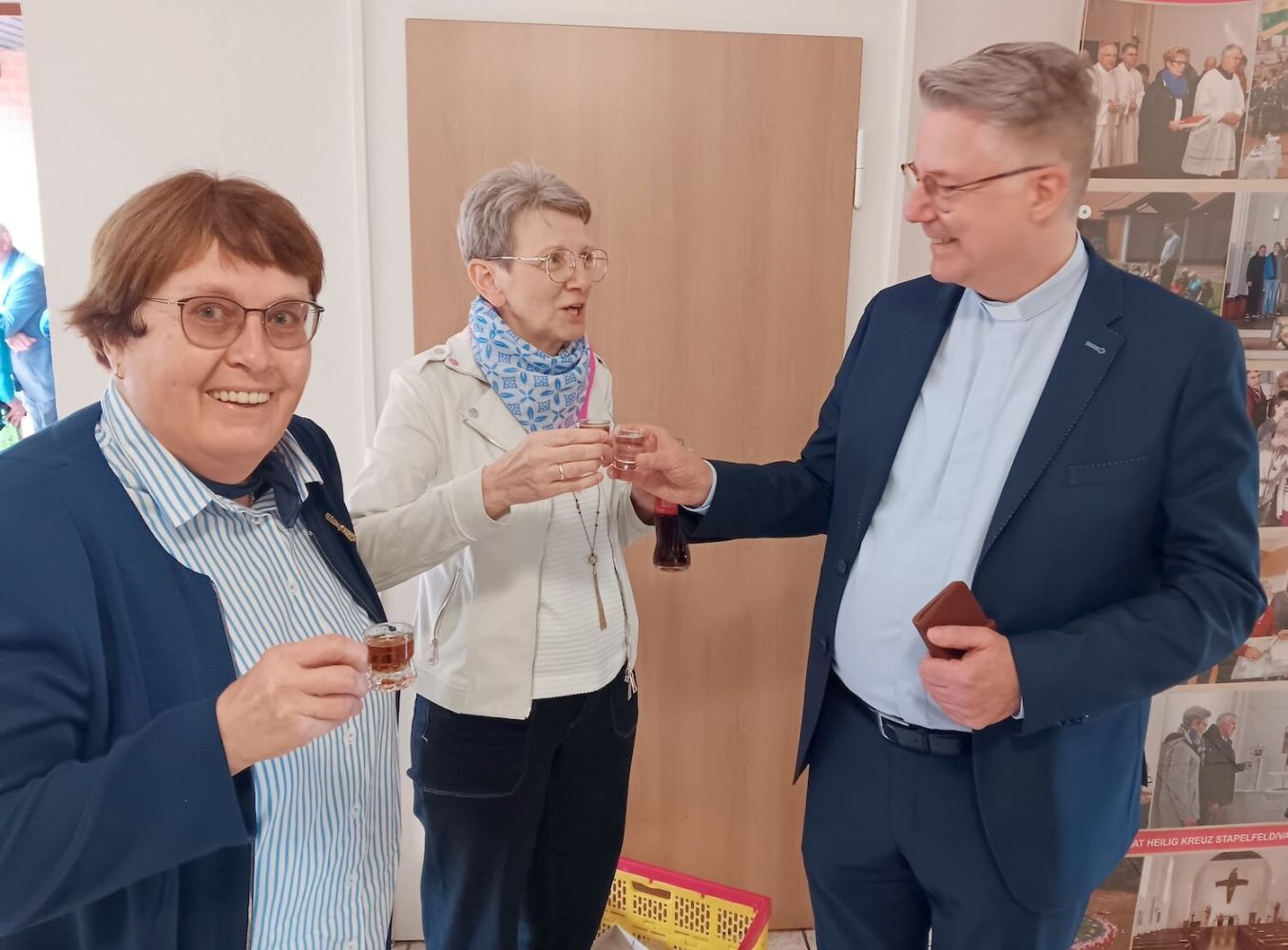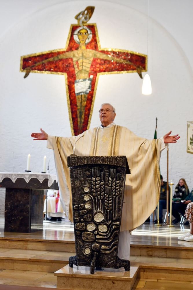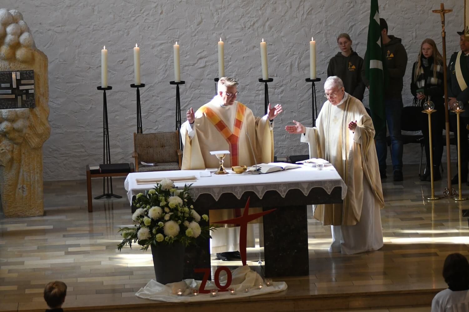 Der 86-jährige, inzwischen emeritierte Priester war von 1974 bis 1987 Pfarrer in Stapelfeld und freute sich sichtlich, nicht nur als Konzelebrant an der Seite von Dr. Marc Röbel wieder einen Gottesdienst hier zu feiern, sondern beim anschließenden Pfarrfest auch viele seiner damaligen „Schützlinge“ wiederzusehen: Ehepaare, die er getraut hatte und die heute schon ihre Goldene Hochzeit hinter sich haben, Taufkinder und Messdiener, die er auf ihren Wegen begleiten durfte und die er alle noch wiedererkannte. Deren Kinder und Enkel lernte Dr. Hagemann dabei auch kennen; einige sangen mit in der neuen Mini-Schola, die für ihren ersten Auftritt mit großem Applaus belohnt wurde, ebenso wie der Chor „Voices“, der das Hochamt mit Liedern zum Thema „Kreuz“ musikalisch gestaltete.