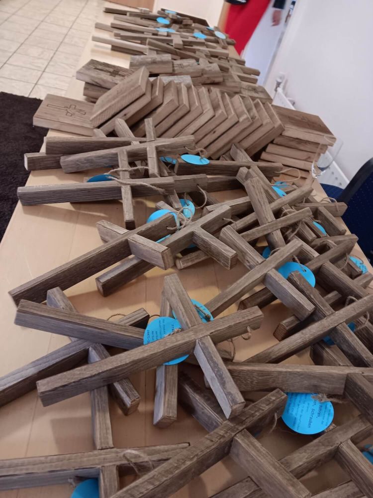 Der Name der Kirche erinnere an den historischen Kreuzkampf 1936. Das Kreuz könne aber auch in heutigen Zeiten ein „Kraftsymbol“ sein, so Hagemann. In Stapelfeld begegne es einem in verschiedensten Varianten: Vom großen roten Kreuzmosaik der Varenseller Benediktinerin Schwester Erentrud Trost im Altarraum über den moderne Gemälde-Kreuzweg von Elisabeth Pawils und Johanna Berges und das Gutmann-Feldkreuz vor dem Portal bis hin zu den Verbeek-Skulpturen im Kirchgarten. Symbol und Historie verbinden können die Kreuze und Kreuzbilder, die das Calo-Team des Caritasvereins aus uraltem Eichenholz gefertigt hat: Die dafür verwendeten Bretter schützten jahrzehntelang die Glocke hoch oben im Stapelfelder Kirchturm, bis sie vor ein paar Jahren erneuert wurden. Nun nutzten viele Jubläumsgäste die Gelegenheit, ein Stück Kirchengeschichte mit nach Hause zu nehmen.
